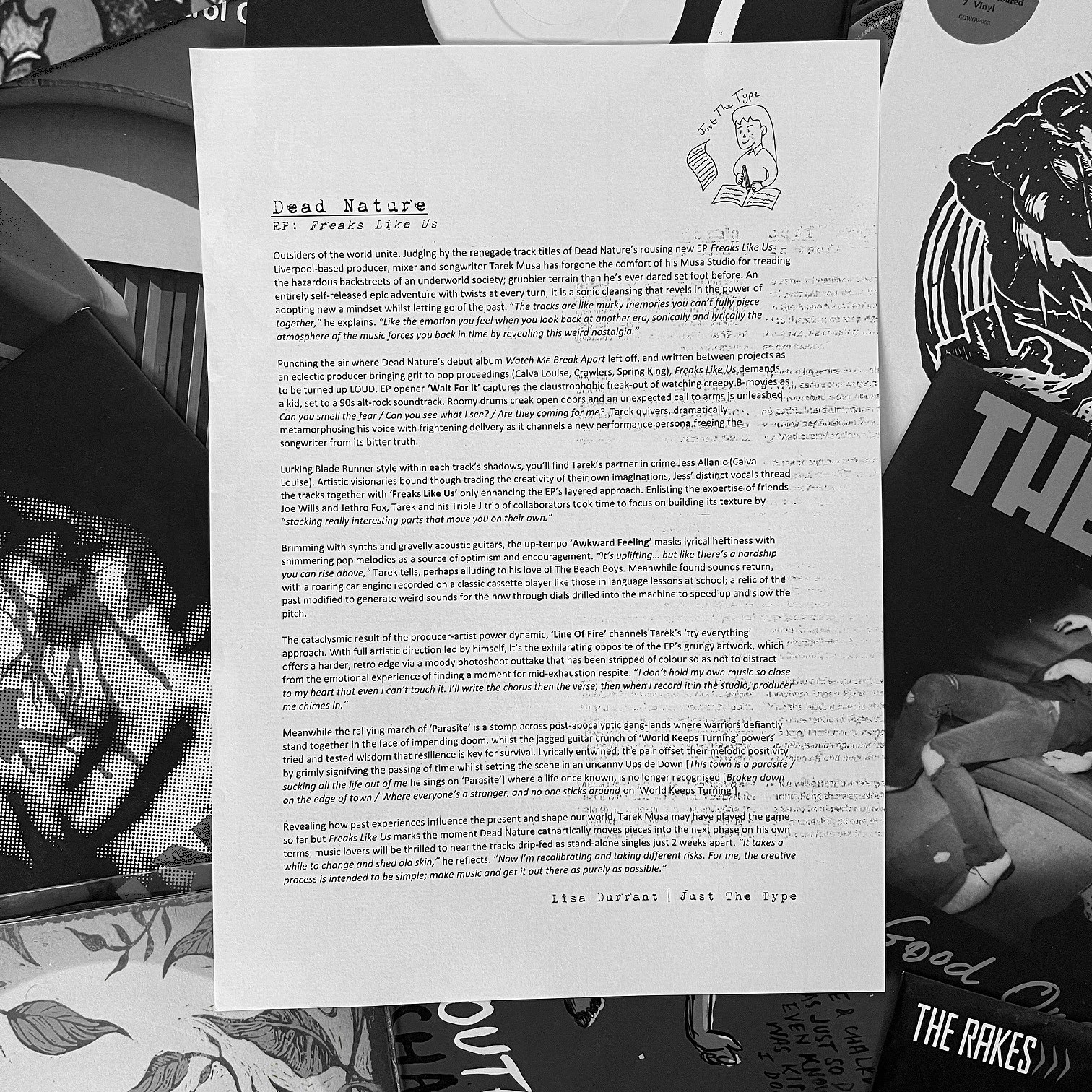 Project Type: Freaks Like Us EP press release (June 2023) following work on his producer/artist biography and album teaser written ahead of publicity for debut album Watch Me Break Apart. These were written for Tarek following discussions over Google Meets, to invite readers into his world as a producer and offer an introduction to his latest songwriting and performing solo project.